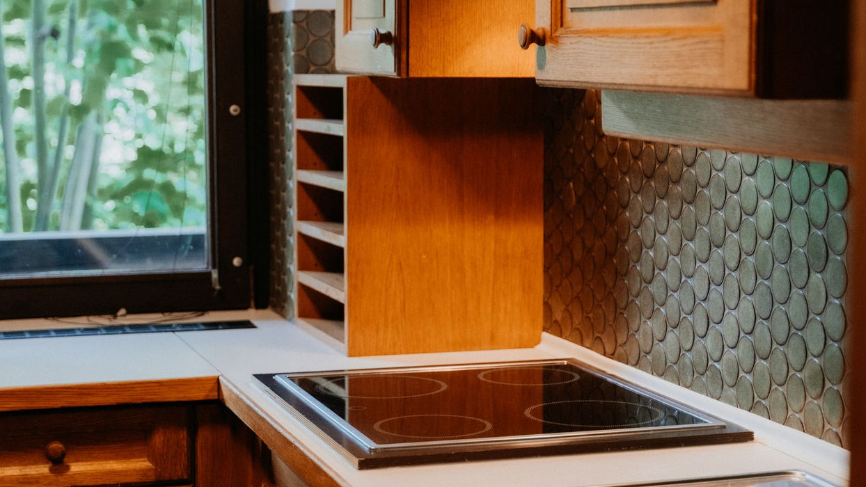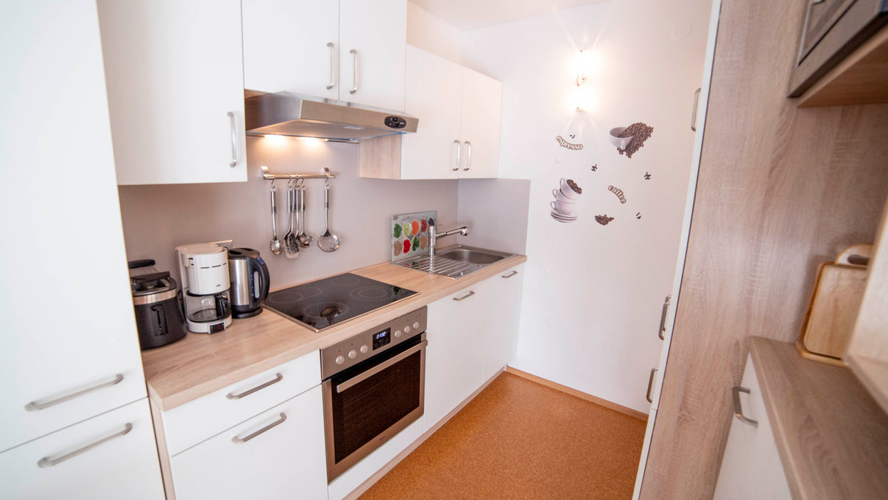 komplett ausgestattet Küche mit Geschirrspüler, Backofen, Herd, Wasserkocher, Geschirr, Kochtöpfe, Gläser, Besteck